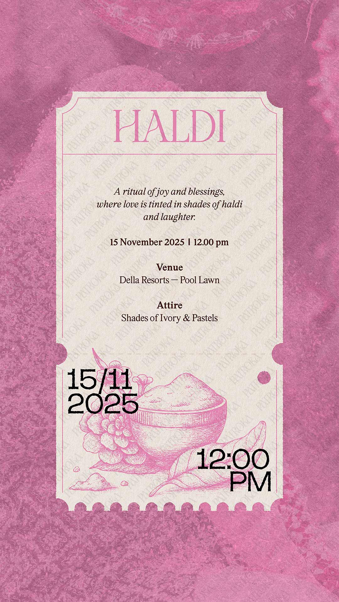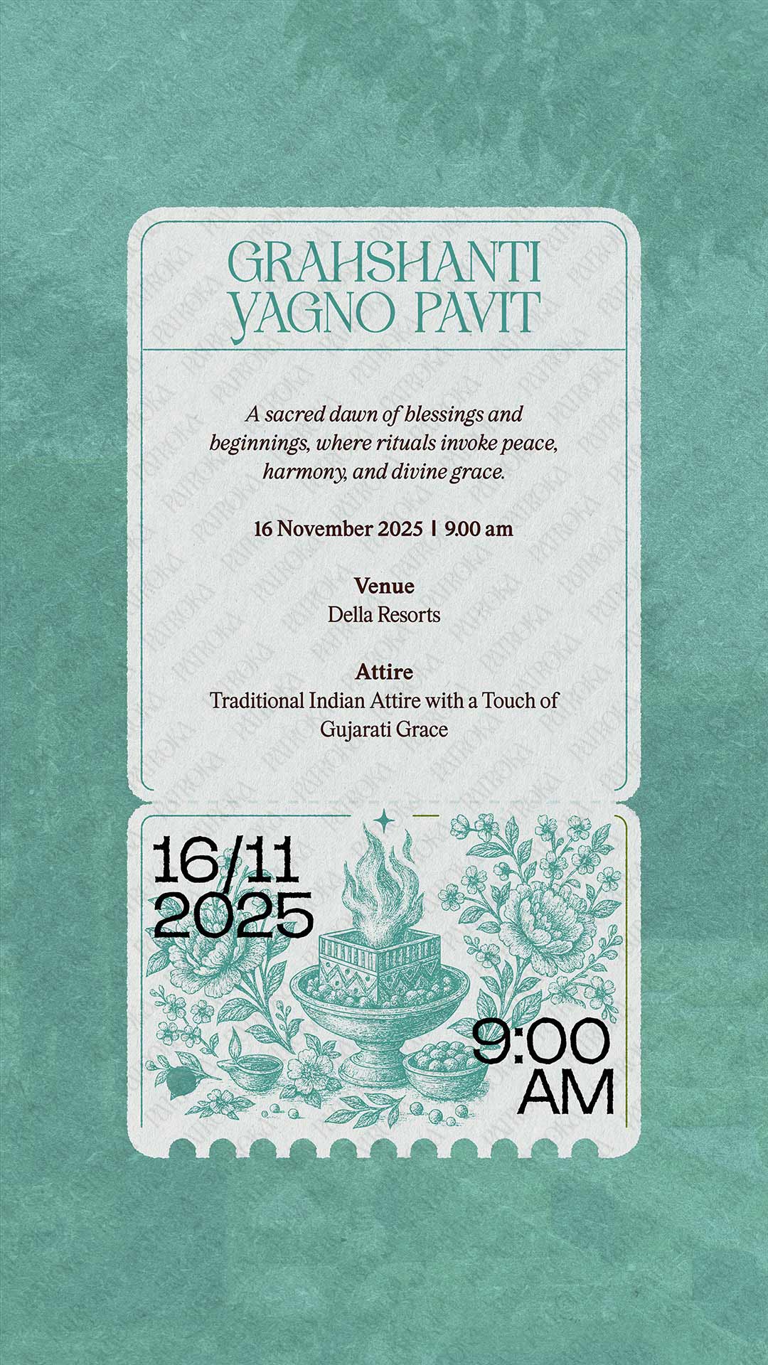 Aarambh — Grace is a gentle expression of beginnings. This six-page static digital invitation draws from Indian ritual imagery, illustrated in a modern toile-de-jouy style and rendered in a soft, pastel-toned palette. Designed as a complete composition, it favours clarity and calm to create an invitation that feels poised, considered, and quietly enduring.