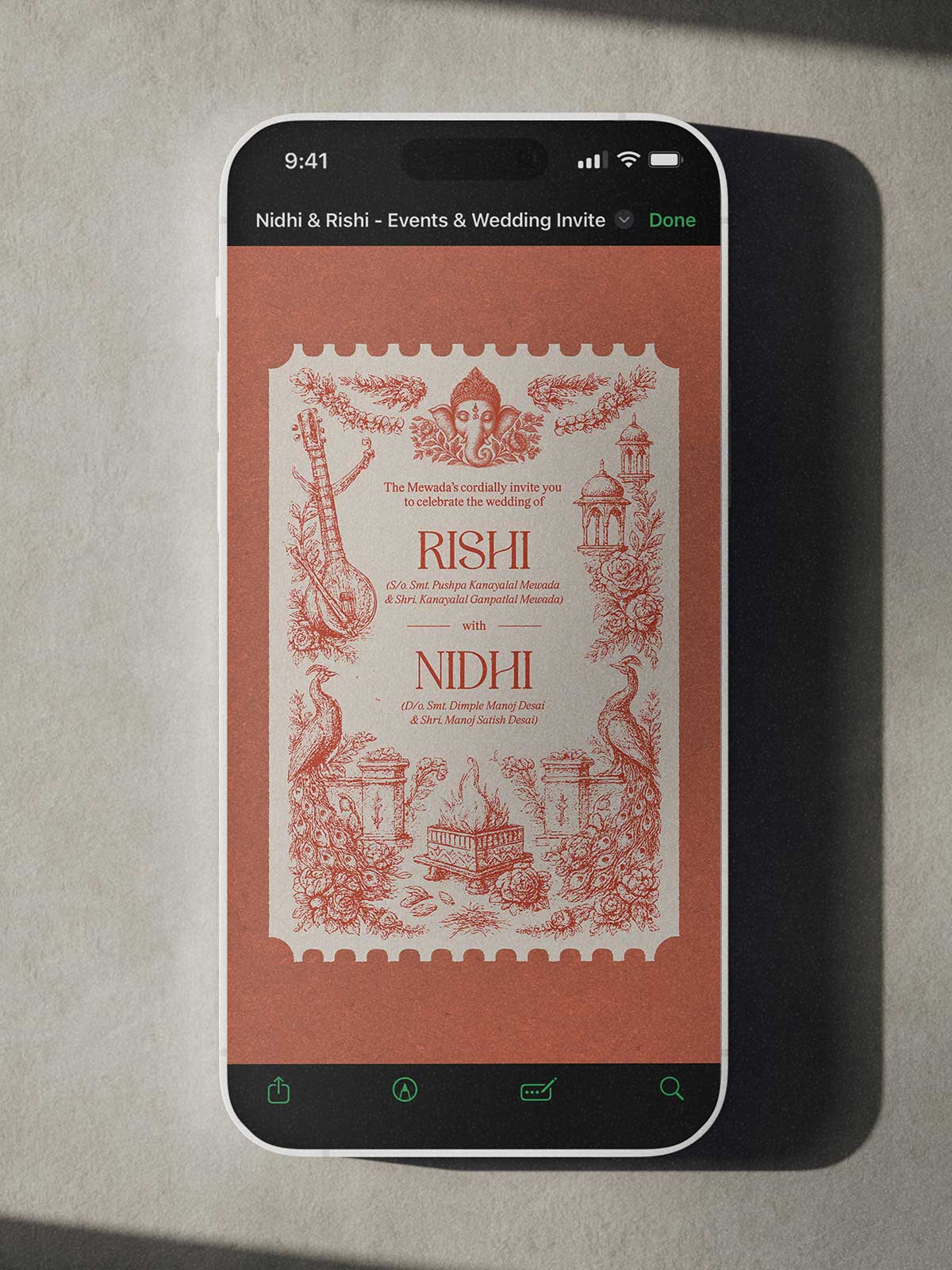 A pastel-toned, six-page digital invitation inspired by Indian rituals, illustrated in a modern toile-de-jouy style.