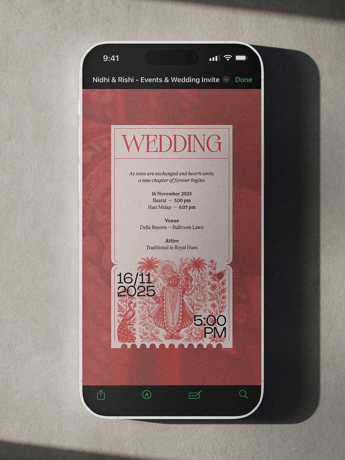 What remains unchanged: The layout, composition, illustrations, typography, colour palette, and overall visual style remain unchanged. Each invitation is designed as a complete format, and personalisation is applied thoughtfully within the existing structure to preserve the integrity of the design.