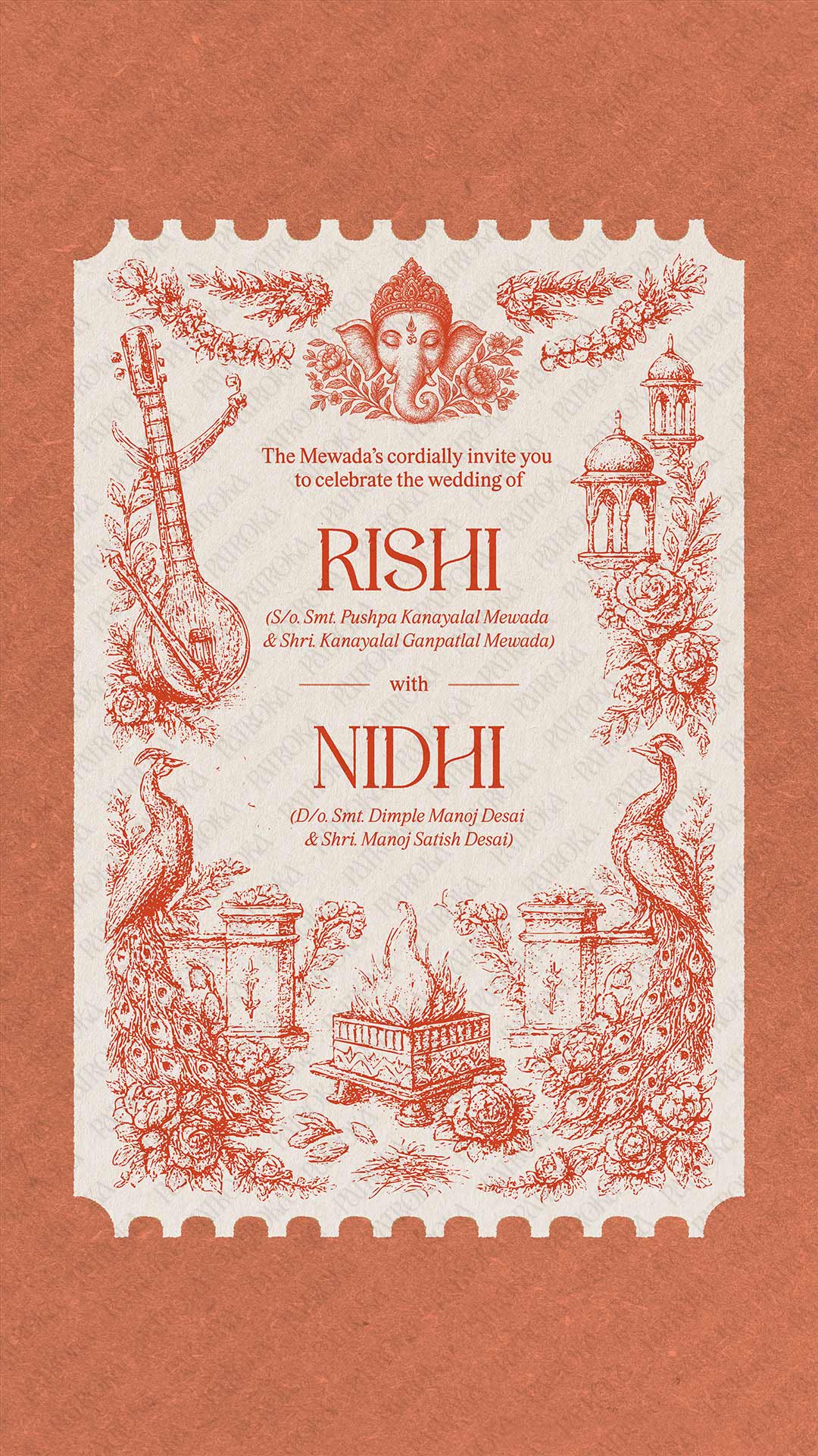 What can be personalised: Names of the couple, family names and relationships, event names, dates, timings, sequence, venue details, and short supporting text are personalised carefully for each invitation.